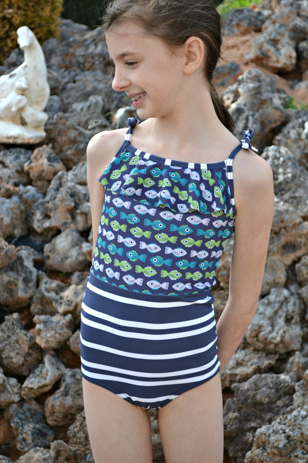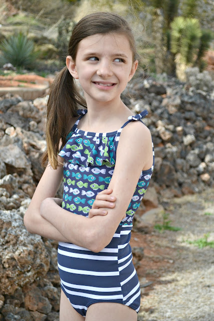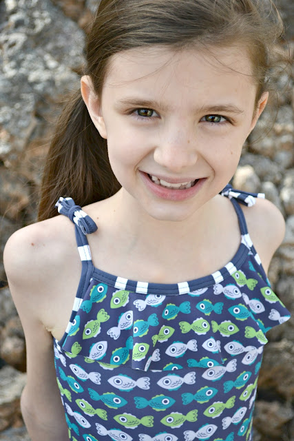 I didn't purposely mean to choose a matching fabric that is unavailable (or did I?? I'm totally joking. I definitely did not intend to make you all pine for something unavailable). The Fish fabric was actually supposed to be a Rash Guard for Jude, but I didn't quite order enough and was a few inches short, so I had to come up with a plan B. So I put my second idea into motion and you will get to see THAT swimsuit tomorrow. After making that swimsuit I had just enough fabric to eek out this top for Paisley and I'm so glad I did! It turned out absolutely perfect!