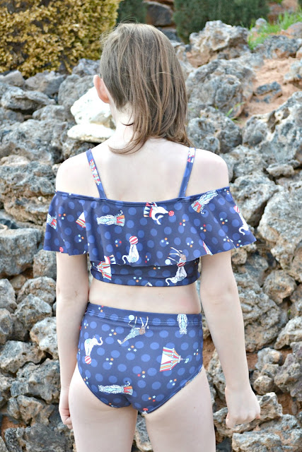 For my suit today, I'm sharing a mix and match set. I had gotten half a yard out of the Circus Boy Stripe and a half yard of the Navy Circus (on preorder) and I got two swimsuits out of them!