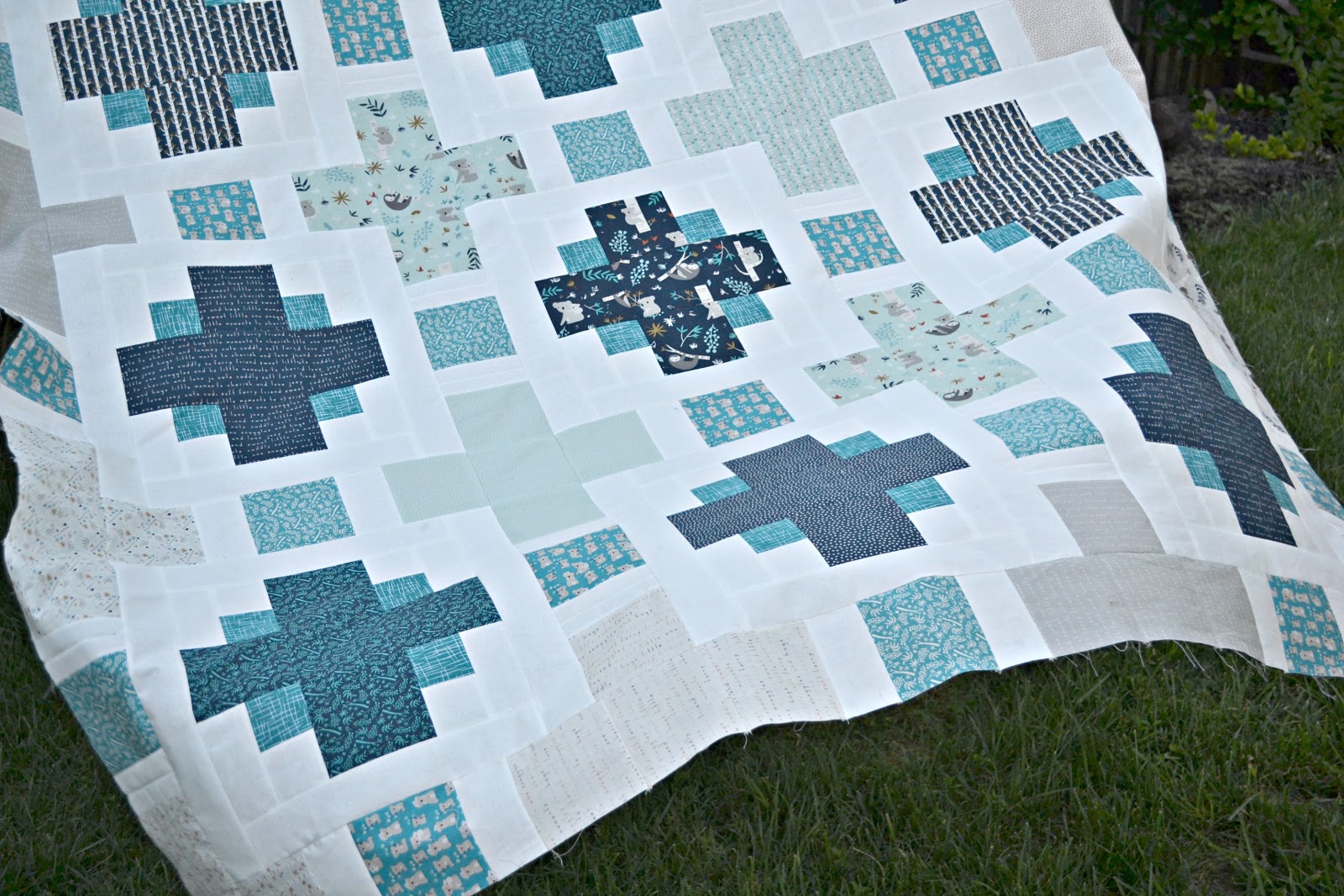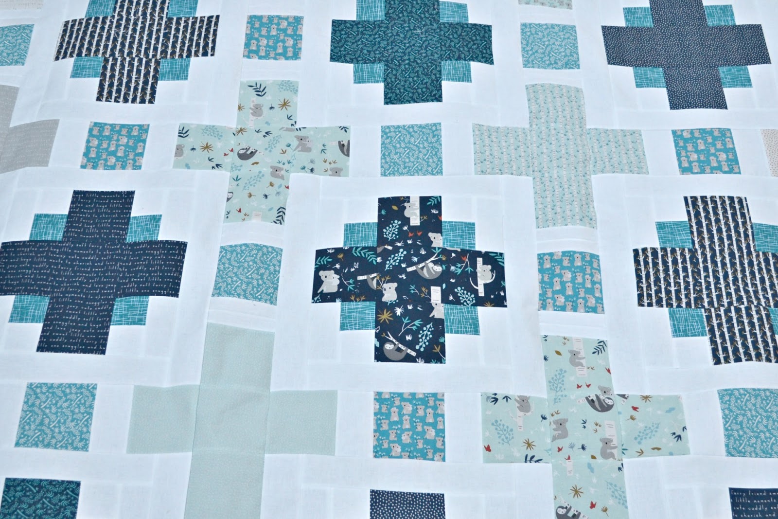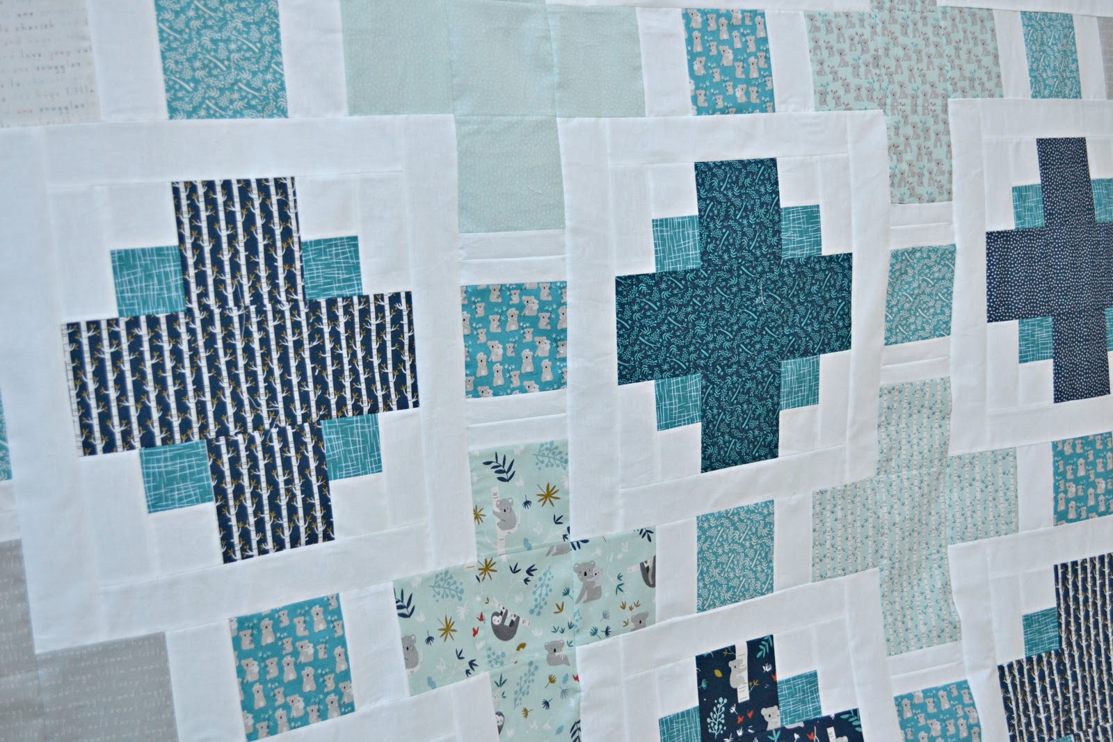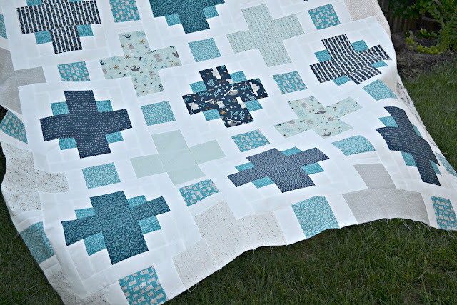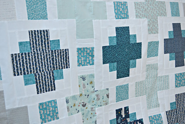 I did play with the prints a bit, so all the inner plus signs are that light aqua/teal prints. The outer prints are alternating off-white and the grey prints, then the main plus signs are in the navy prints. And then of course I have all the little squares in that bold teal.