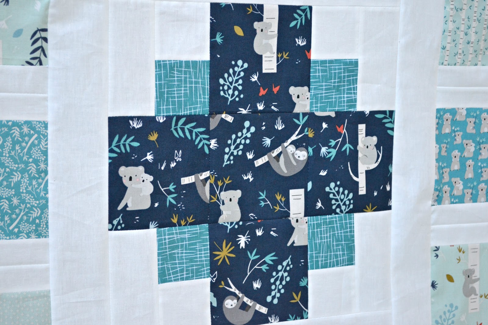 Joey by Deena Rutter is seriously the sweetest and most adorable line! If I was ever to have another baby, this line would dictate that babies entire room. Since there will be no more babies for me, I chose to make a twin size quilt. I just love the colors and we're talking about Koalas and Sloths here. It just doesn't get cuter than that!