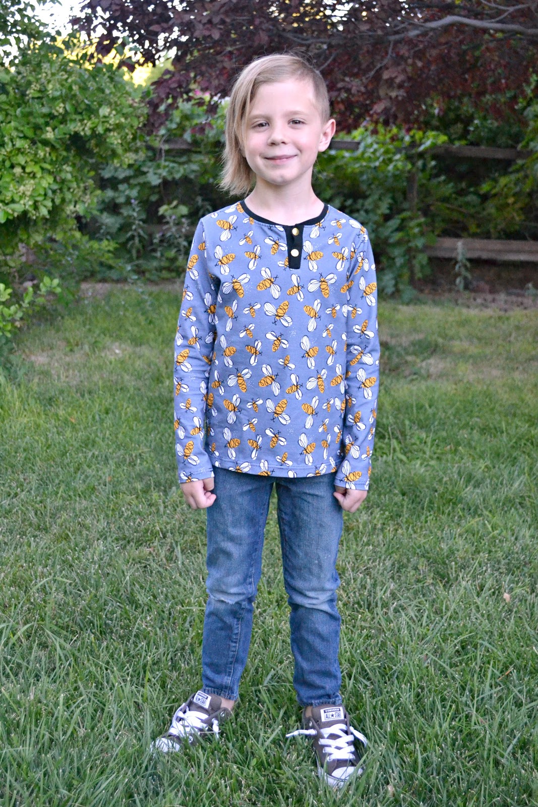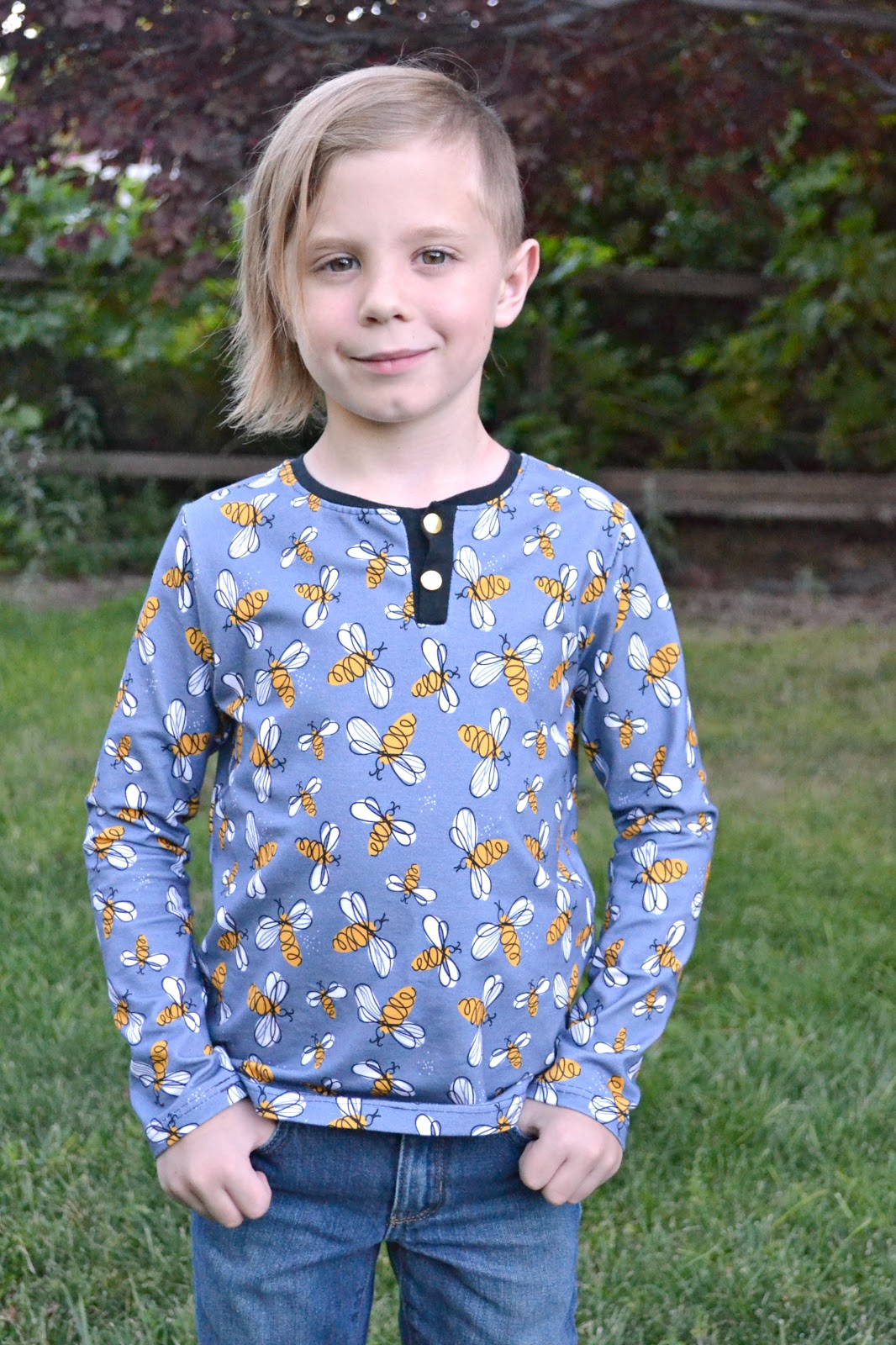 The fabric is Mimi's Custom Fabric Bee's that Jude picked out especially because he loves them. He's also really into all the long sleeved shirts and hoodies and jeans. We live in the desert and it's been over 100 degree's every day! And this child wants long sleeved shirts, hoodies, and jeans!