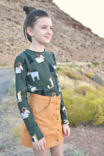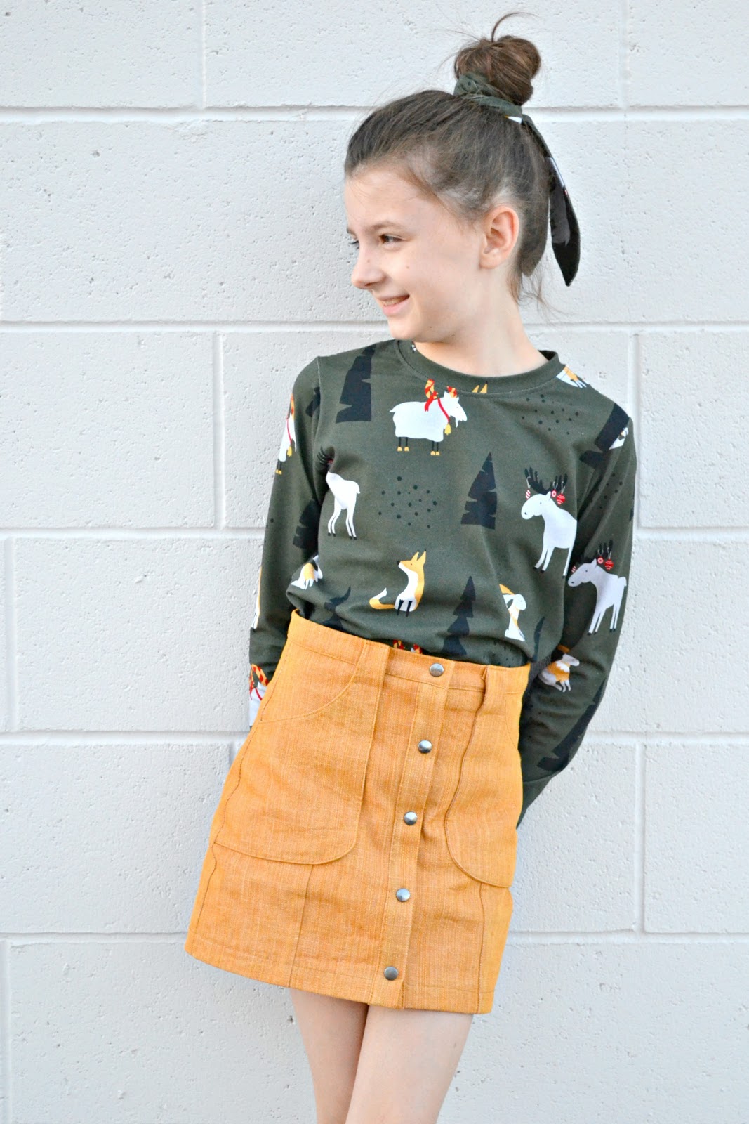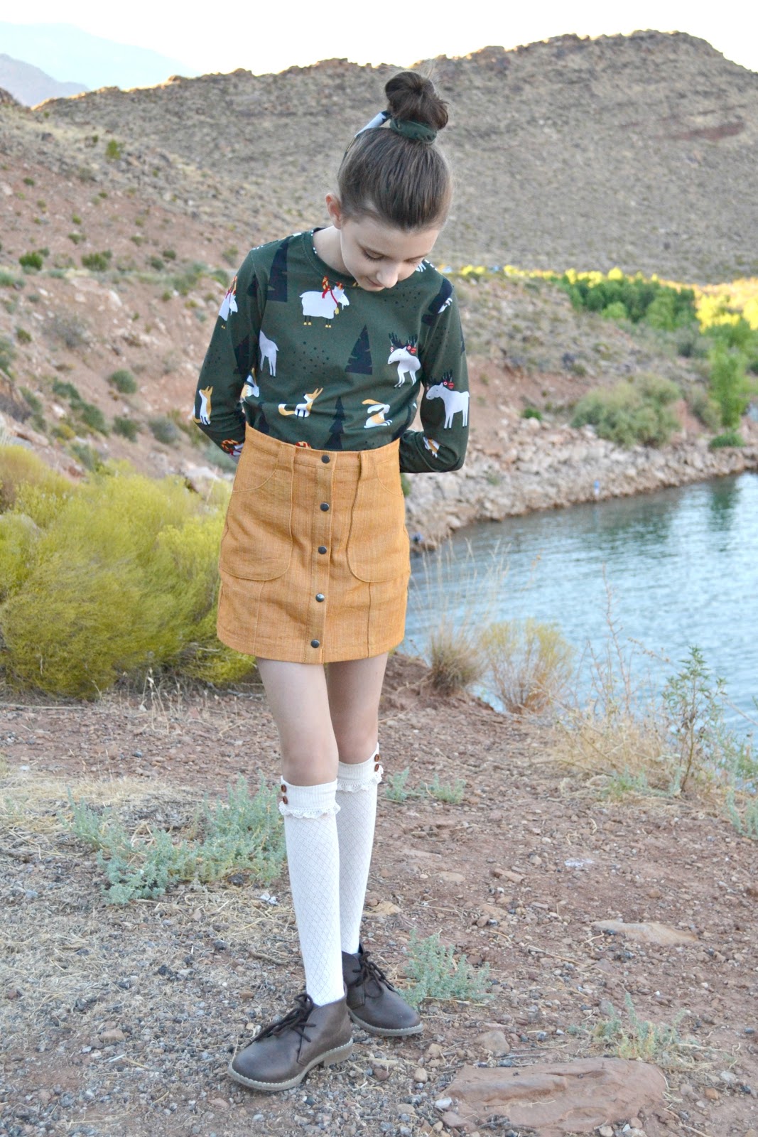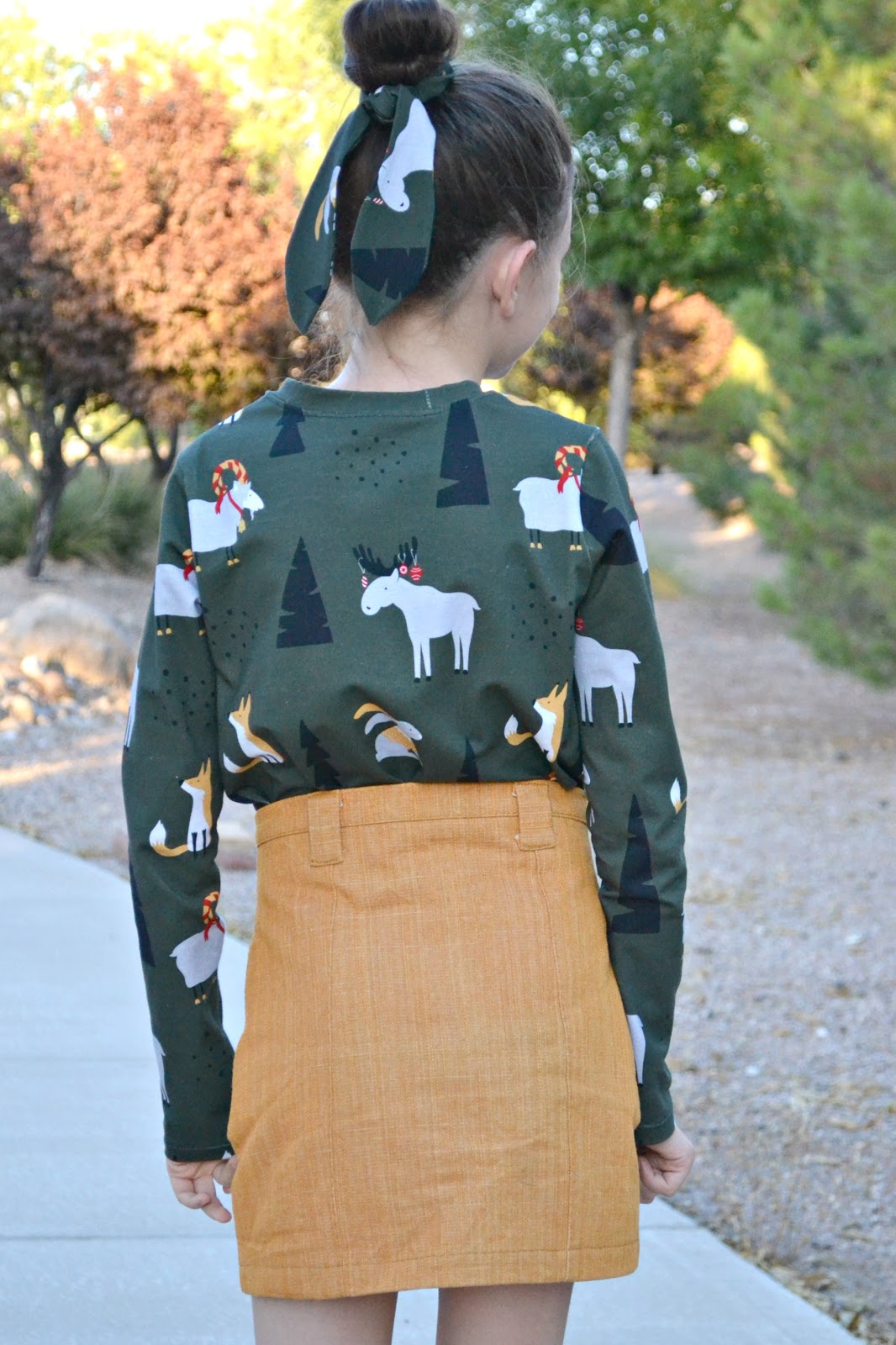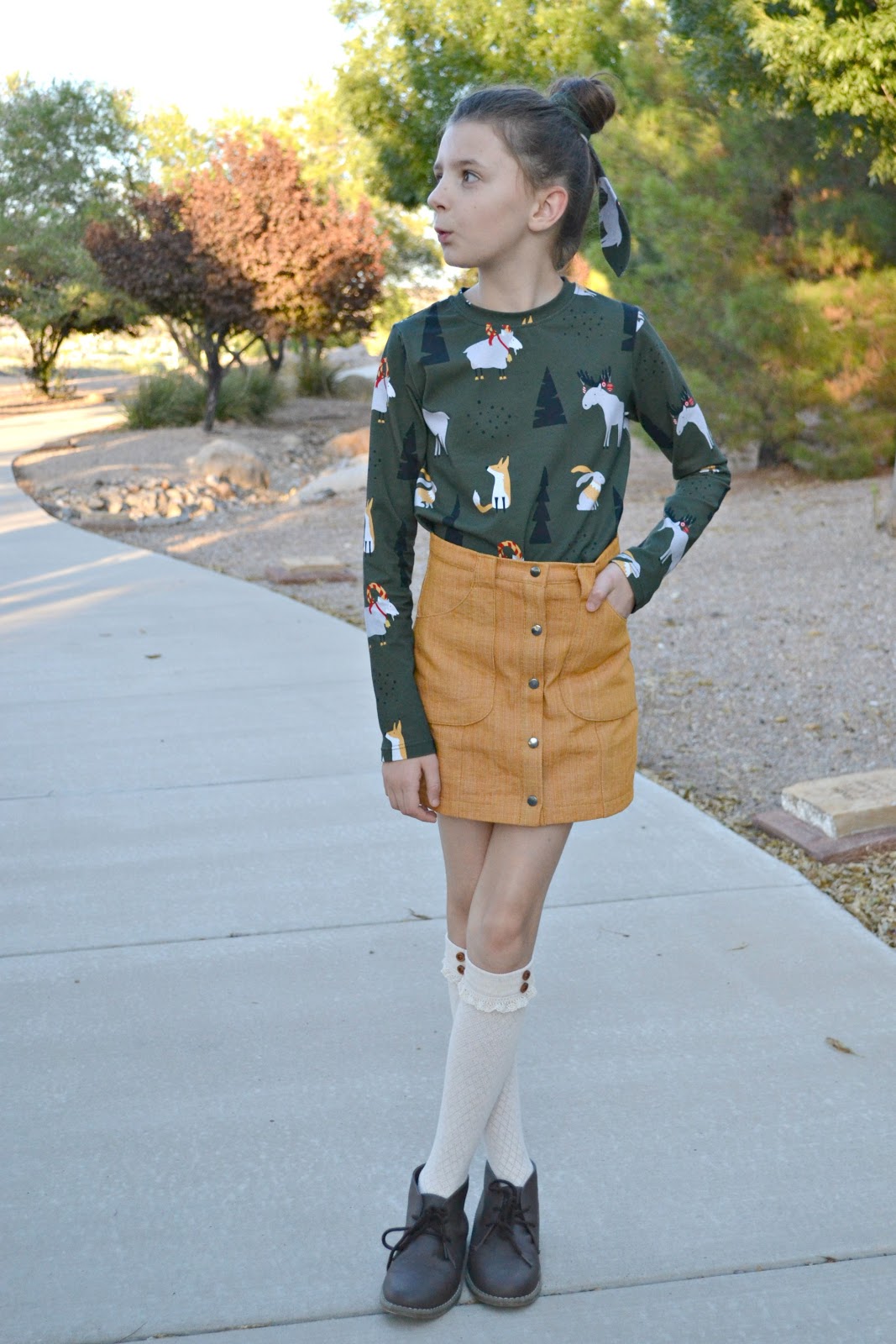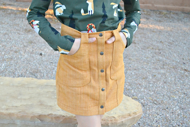 I absolutely love that fabric paired with the mustard skirt. Too cute!
