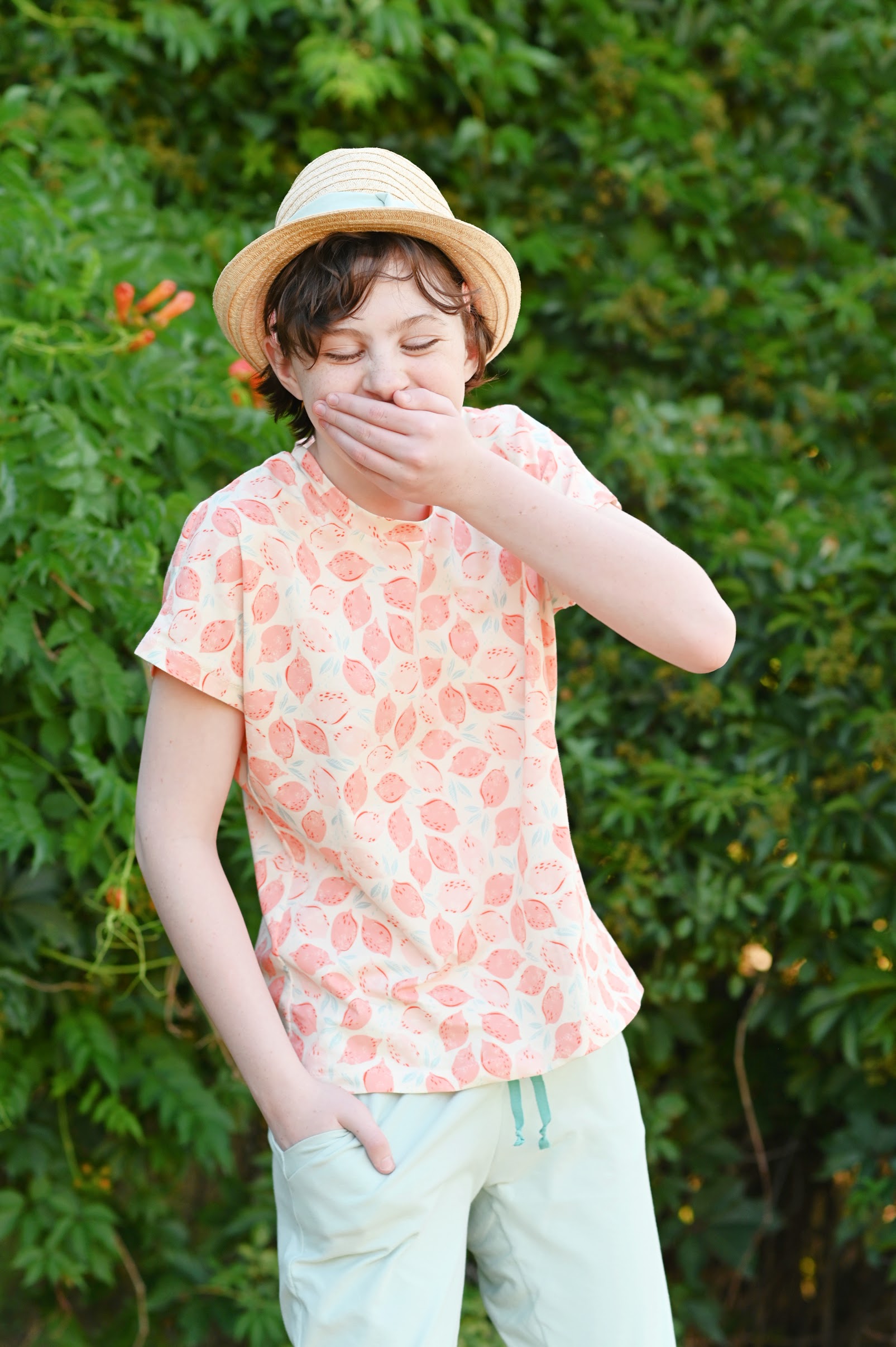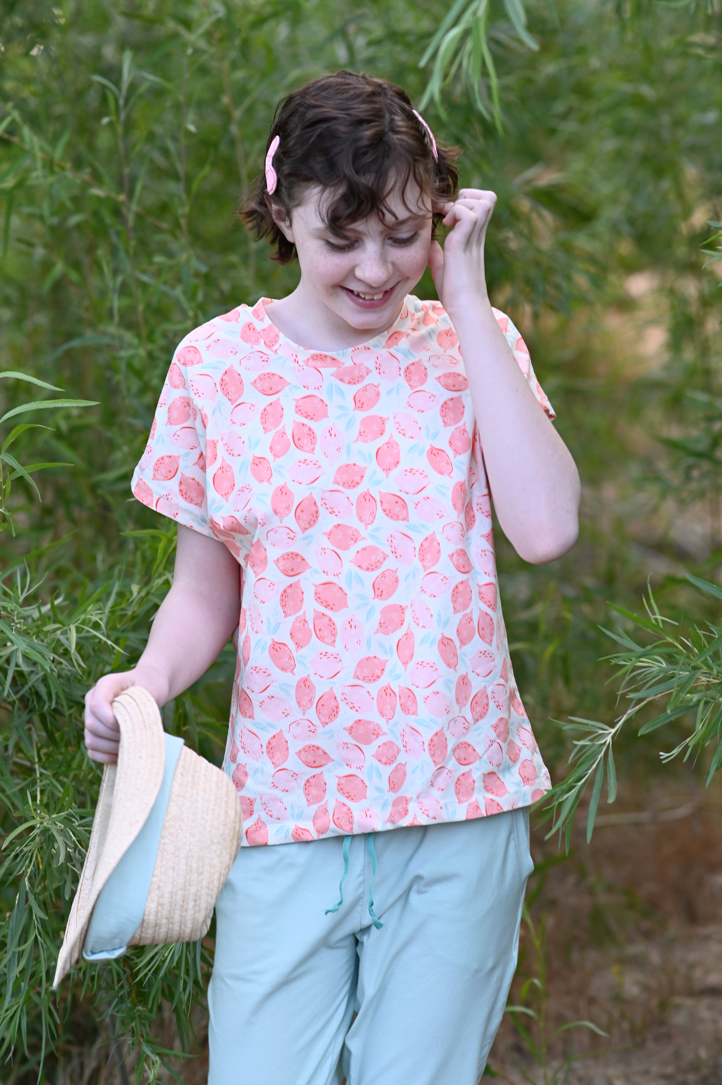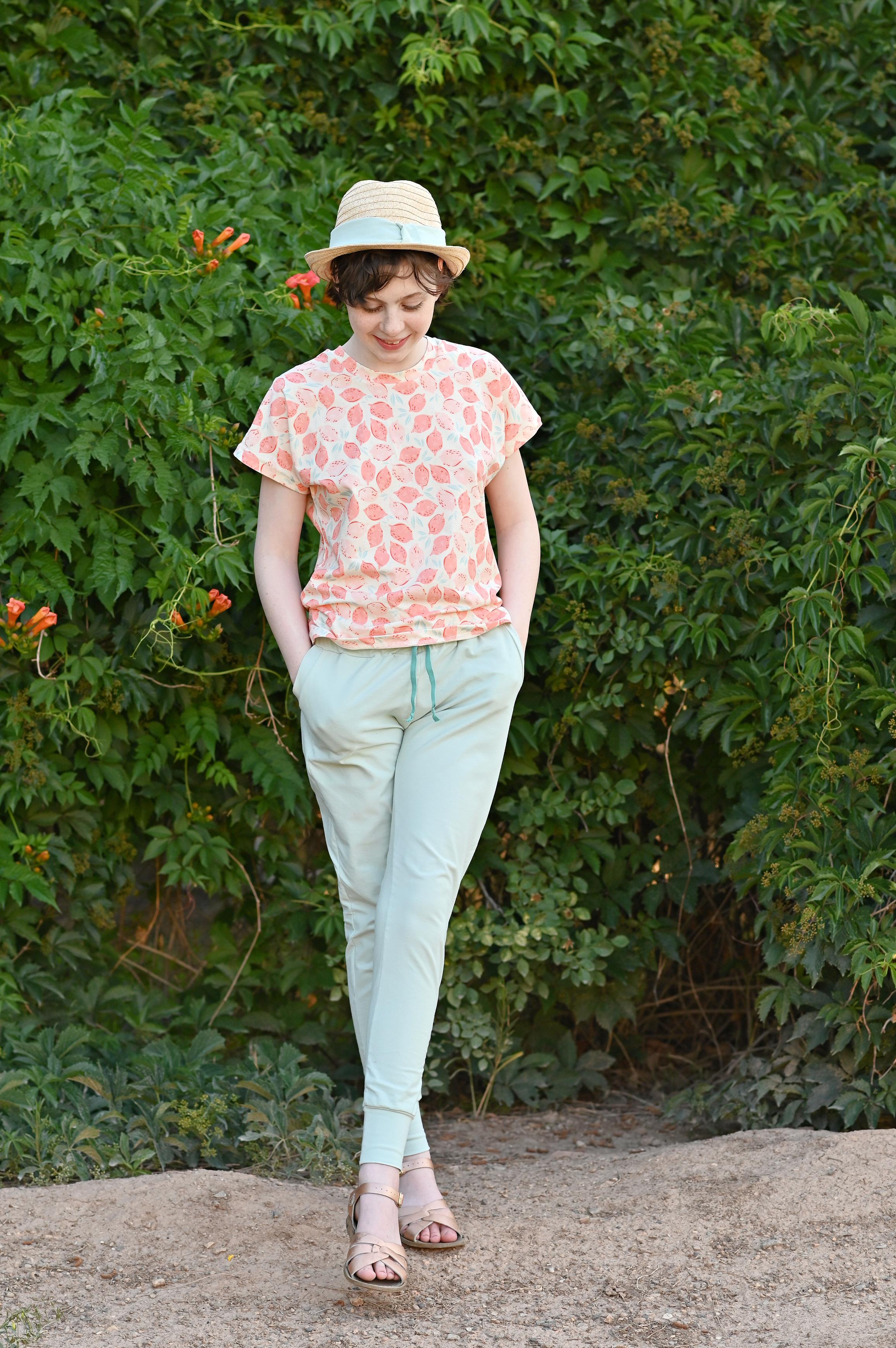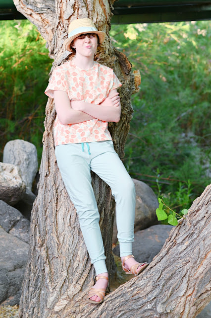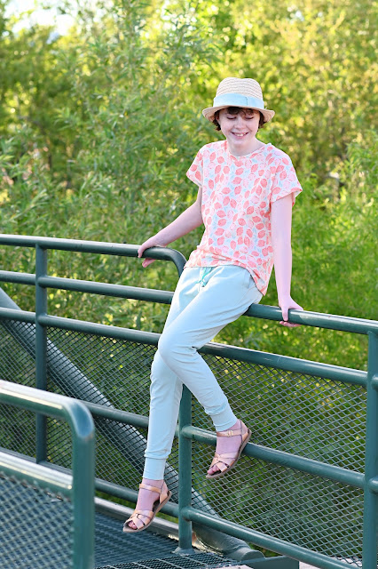 The pants are out of Art Gallery Warm Wave Solid Knit. Zoe loves them because they are so light and airy, which is perfect when the weather is hot.