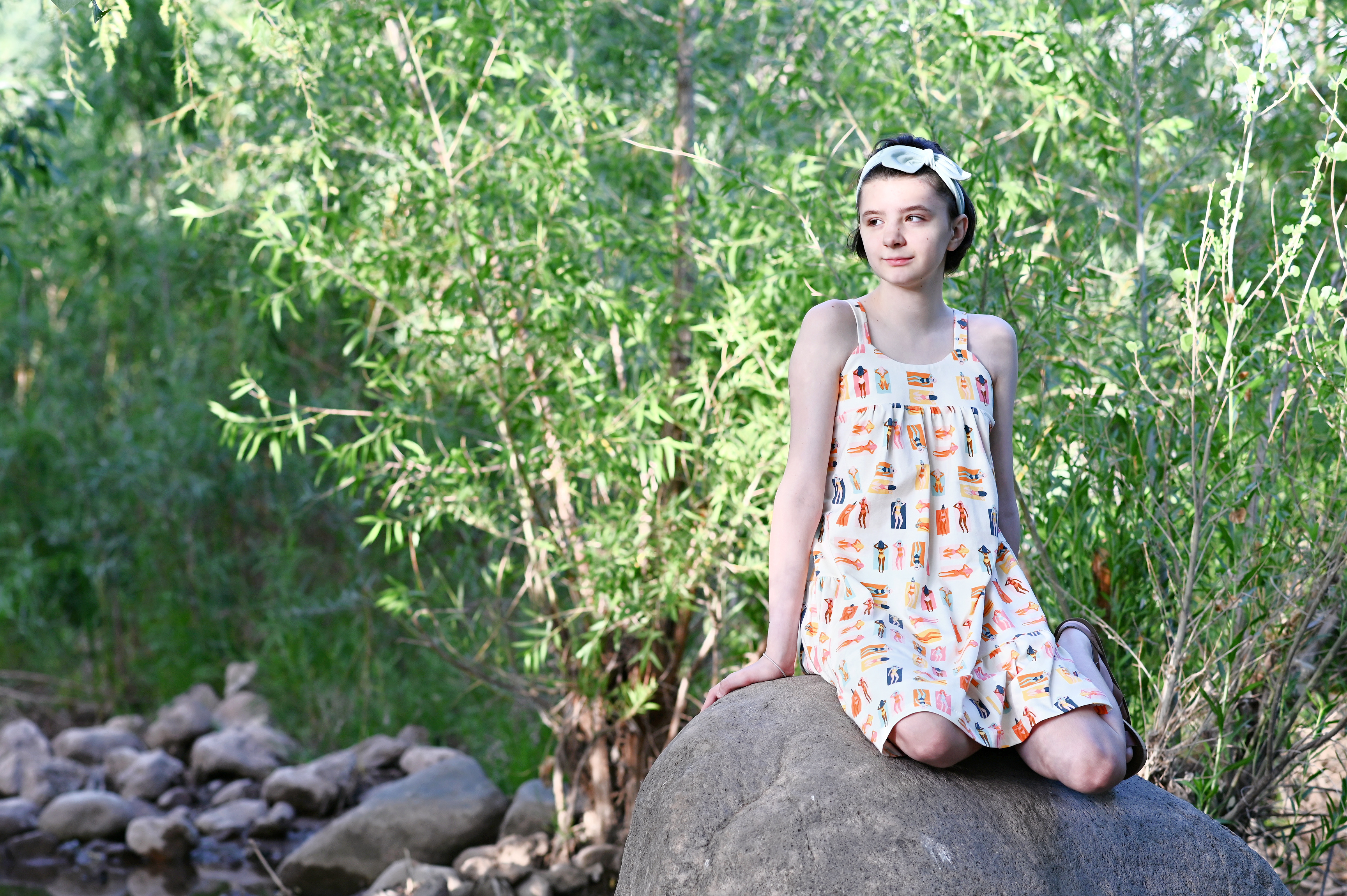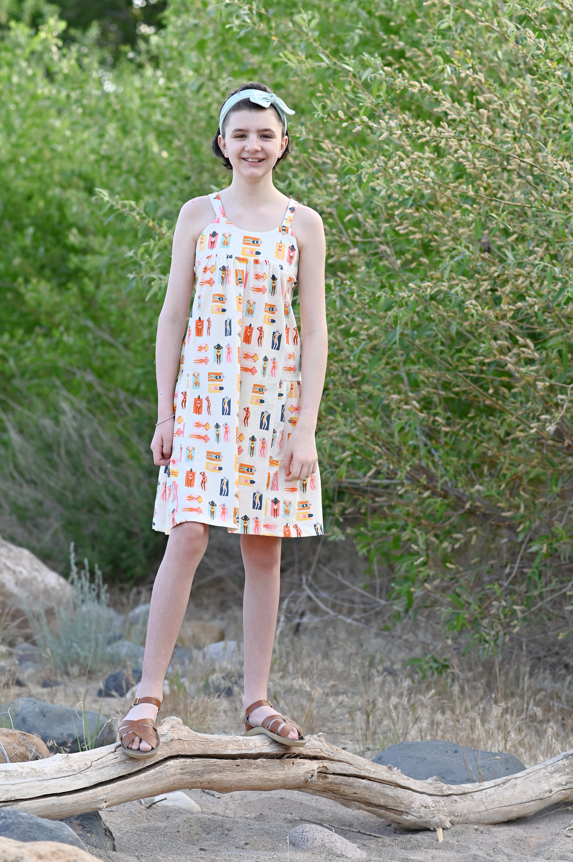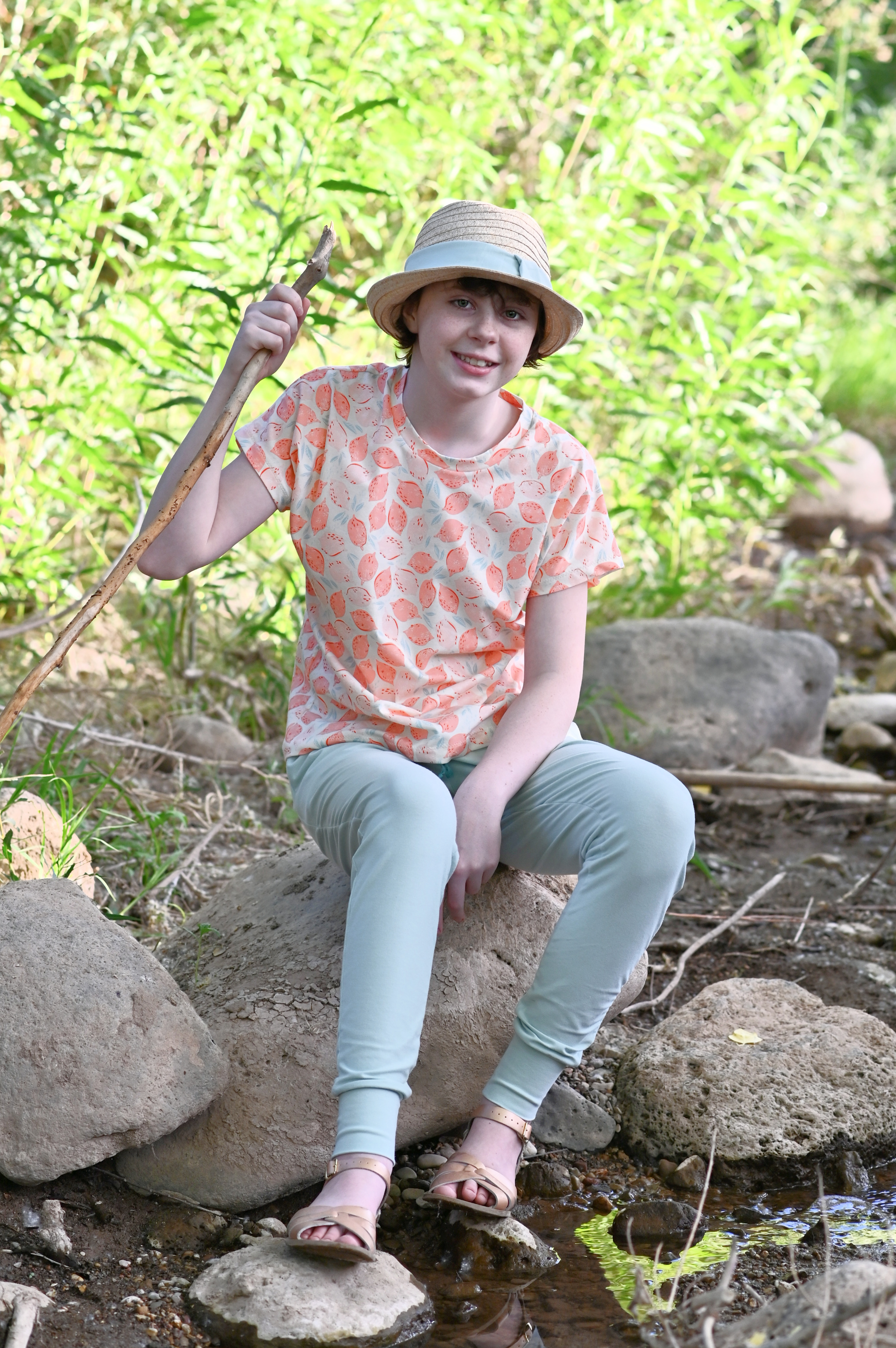 The pants are out of Art Gallery Warm Wave Solid Knit. Zoe loves them because they are so light and airy, which is perfect when the weather is hot.
