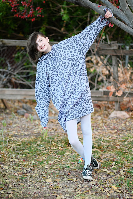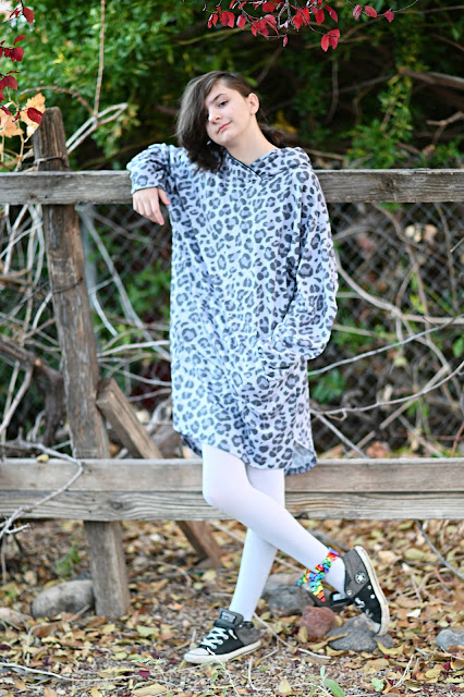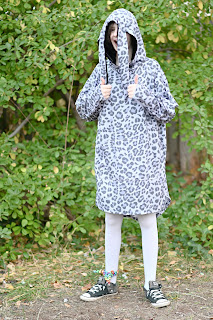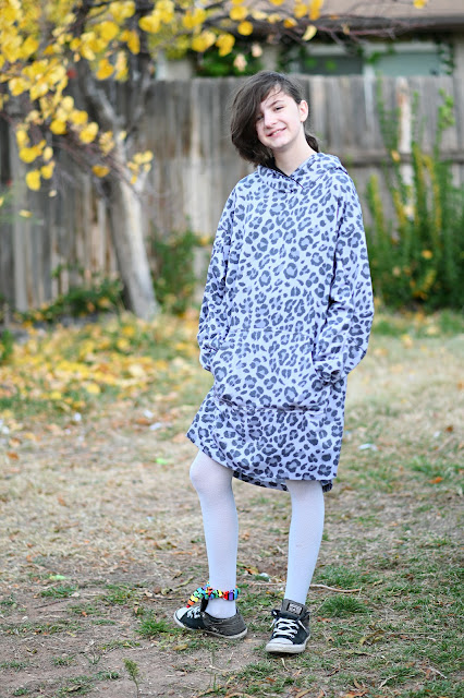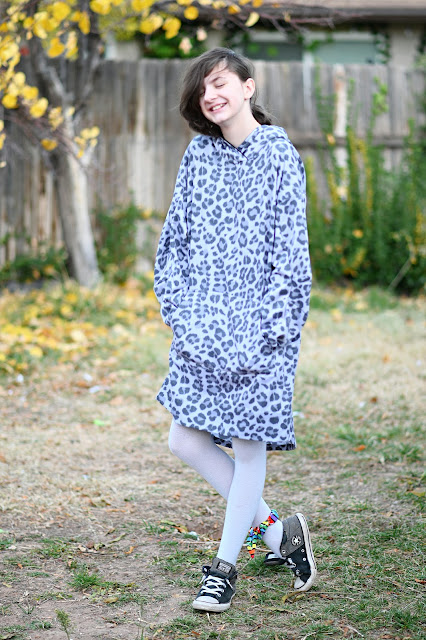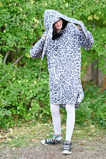The fabric is Tonal Grey Leopard Heathered Fleece Sweatshirt Knit Fabric from Raspberry Creek Fabrics and I used Black Stretch Velvet Knit for the hood.